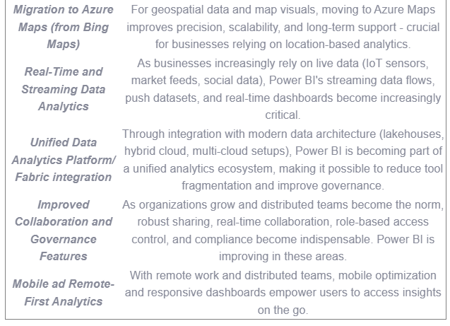Continuous Innovation and Alignment with Trends: Microsoft's ongoing investment ensures Power BI evolves, embracing AI, cloud/hybrid, real-time analytics, modern data architecture, and governance, thereby staying future-ready.